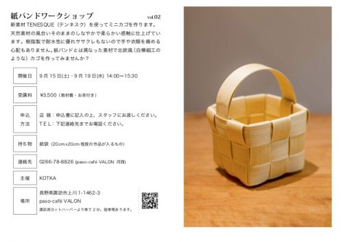 新素材TENESQUE(テンネスク)を使ってミニカゴを作ります。天然素材の風合いそのままのしなやかで柔らかい感触に仕上げています。樹脂製で耐水性に優れササクレもないので手や衣類を痛める心配もありません。紙バンドとは異なった素材で北欧風(白樺細工のような)カゴを作ってみませんか?